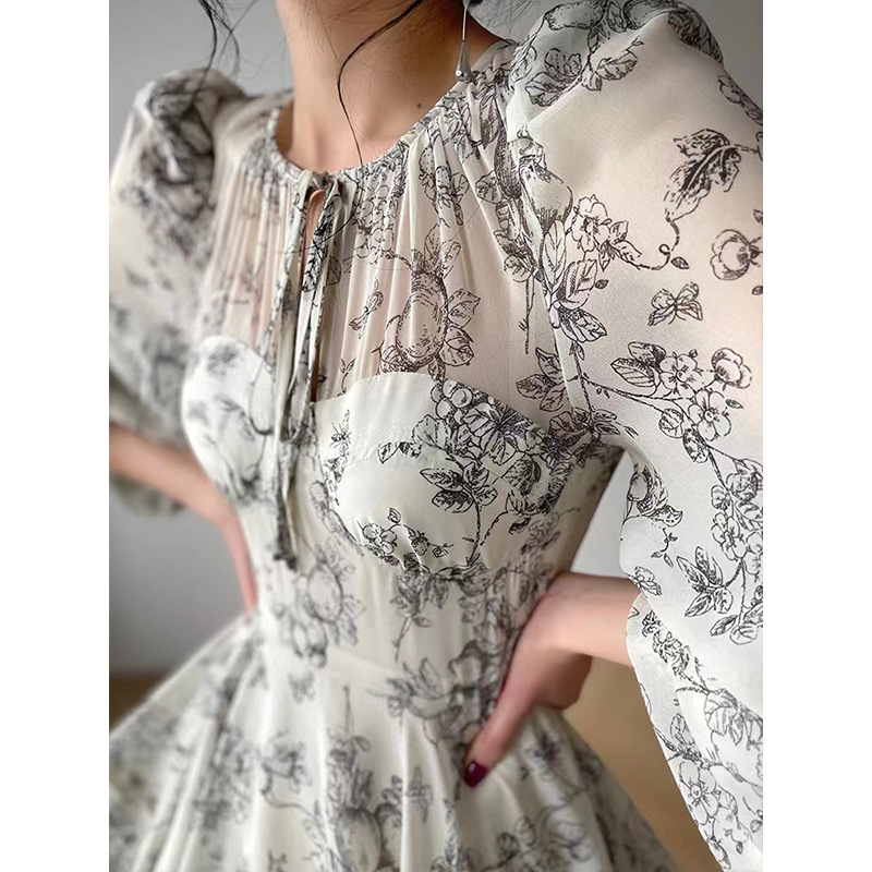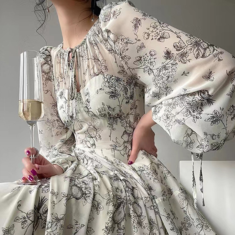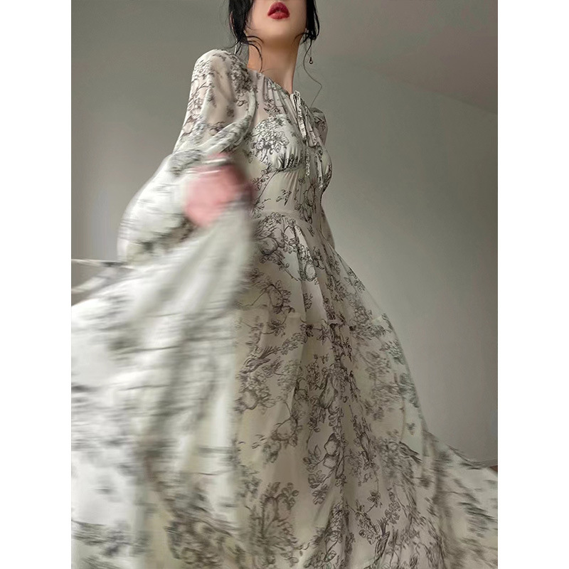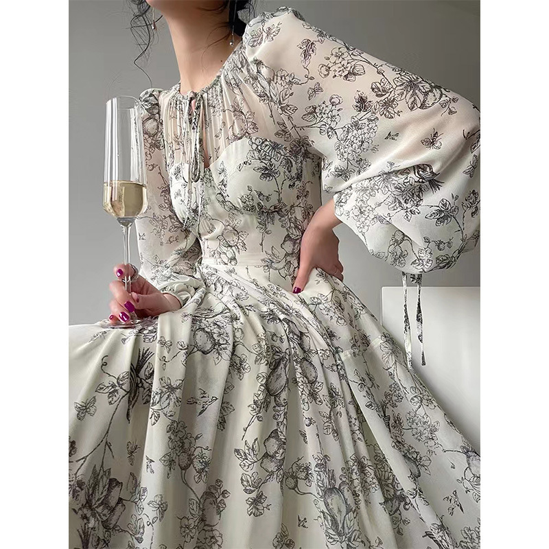 Beige Floral Print Long Sleeve Midi Dress